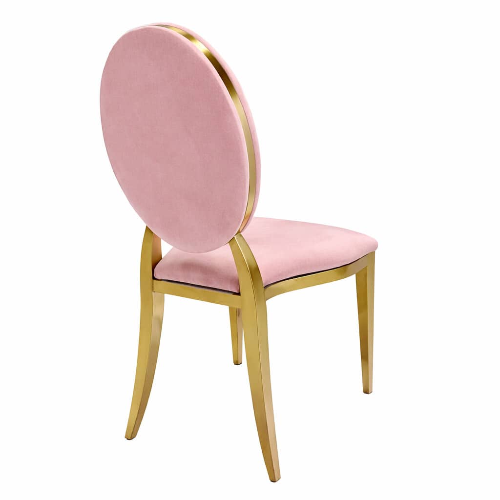 - Różowe siedzisko + puste oparcie – delikatny akcent kolorystyczny Dzięki temu krzesło można łatwo dopasować do kolorystyki dekoracji, kwiatów, obrusów i motywu przewodniego wydarzenia.