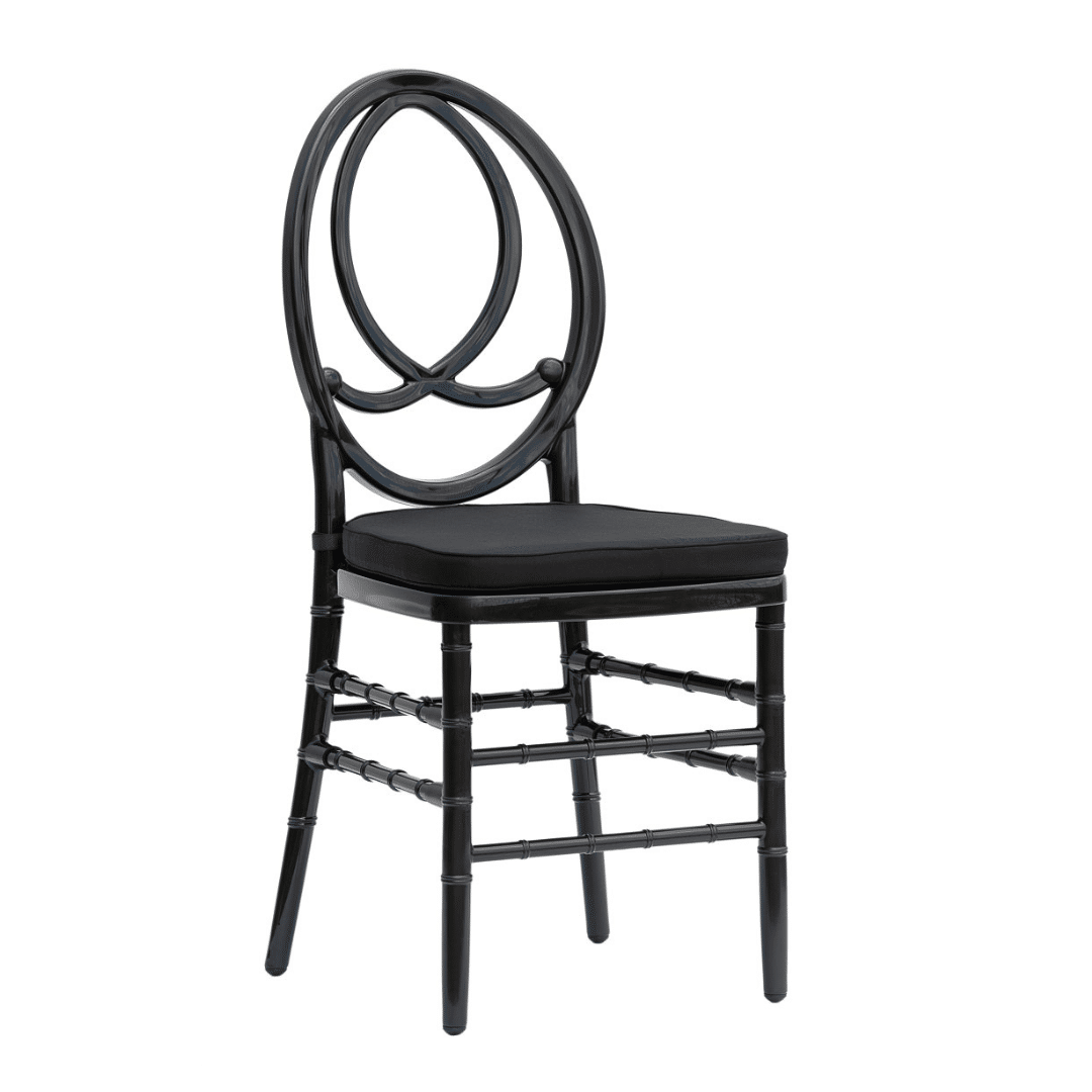 Krzesło Phoenix to doskonały wybór na eleganckie wydarzenia, takie jak wesela, bankiety, przyjęcia oraz inne uroczystości. Wykonane z trwałego tworzywa sztucznego w kolorze czarnym, łączy w sobie nowoczesny styl i klasyczną elegancję. Dodatkowo, w zestawie znajduje się czarna poduszka, która zwiększa komfort siedzenia.