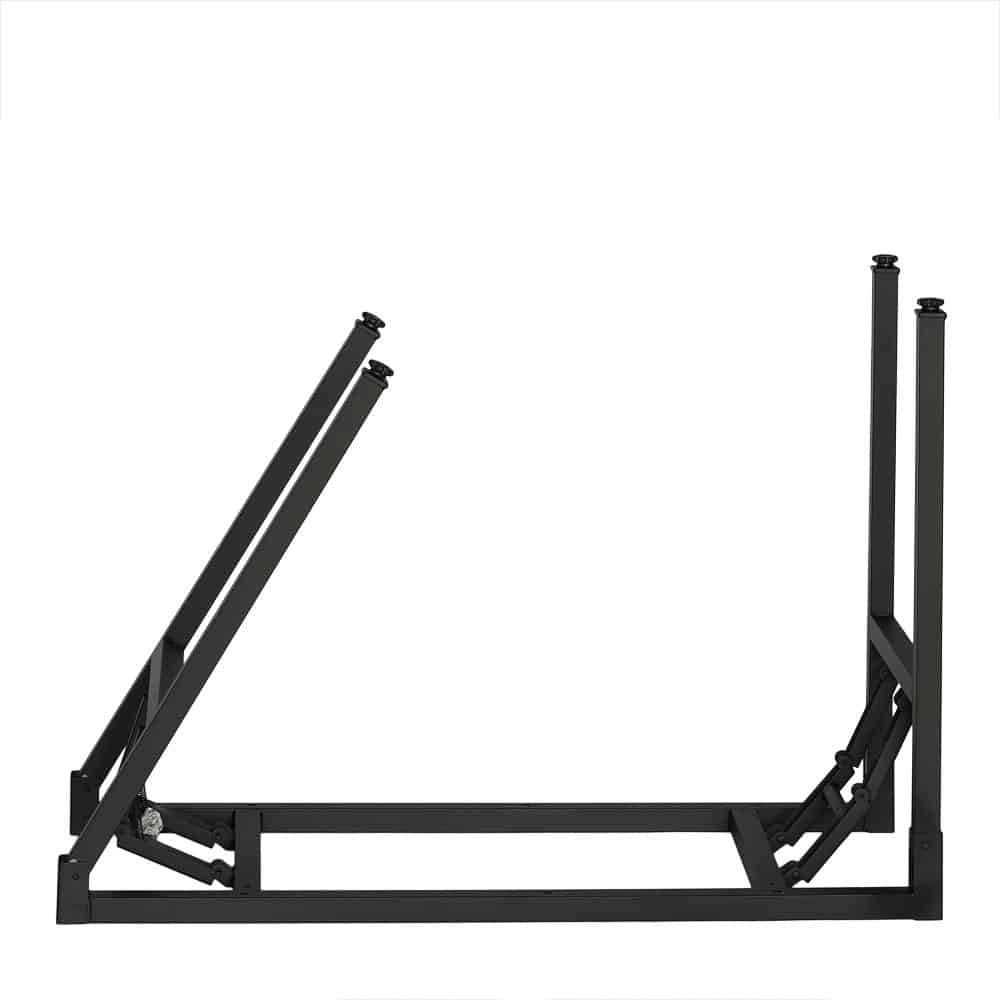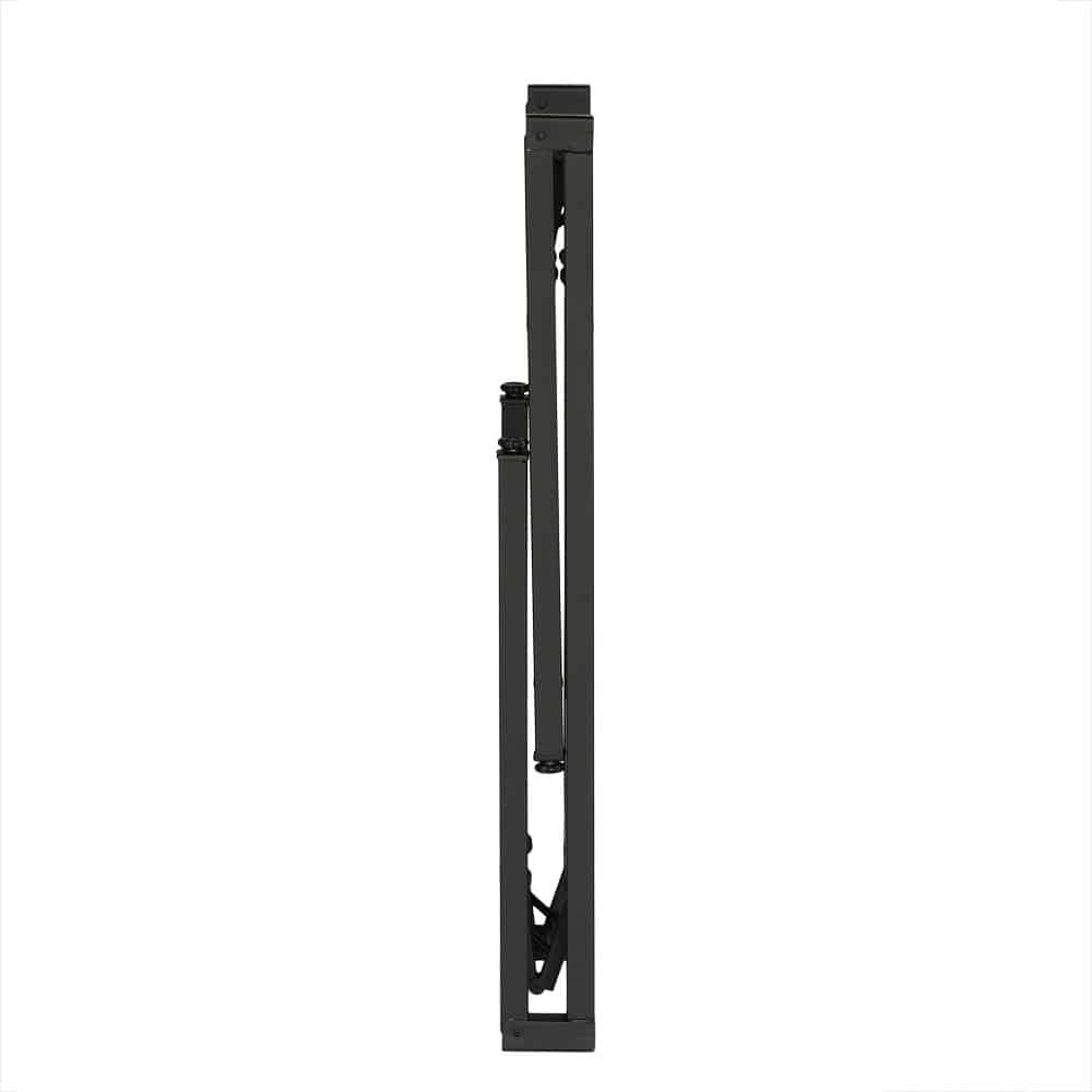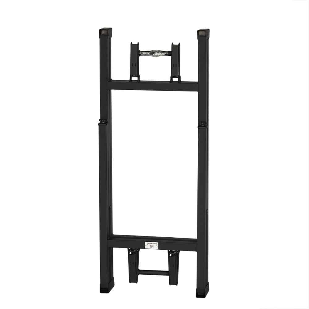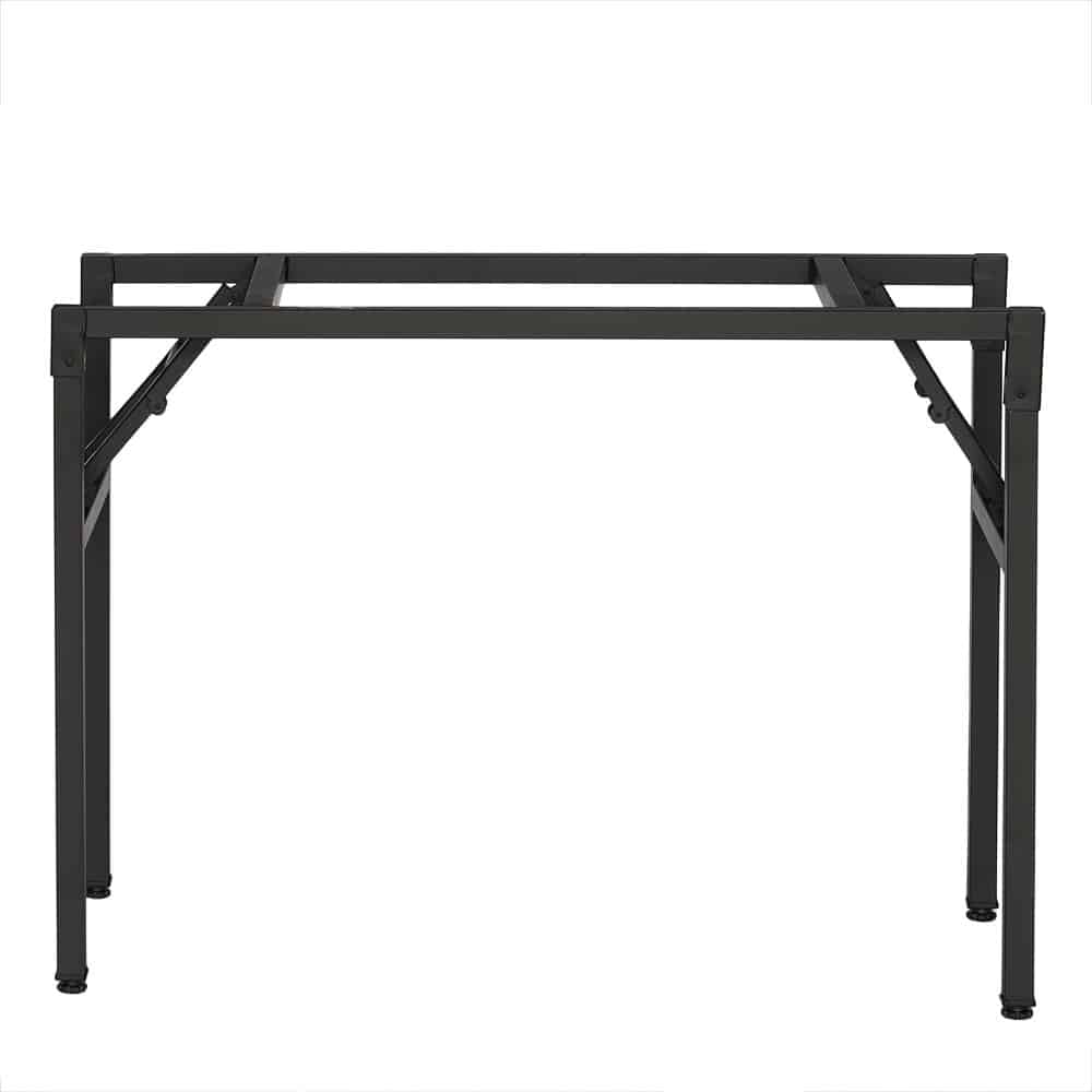 Stelaż stołu został wykonany z wytrzymałej stali o grubości 1,2 mm i pomalowany proszkowo na kolor czarny, co zwiększa odporność na zarysowania i korozję. Składana konstrukcja stelaża pozwala w szybki sposób przygotować stół do użytku, a gdy nie jest potrzebny – wygodnie go złożyć i przechować. Stopki z tworzywa sztucznego na końcach nóg chronią podłogę przed uszkodzeniami i zapewniają stabilność na każdej powierzchni.
